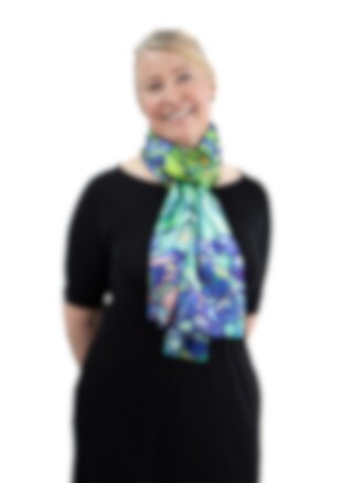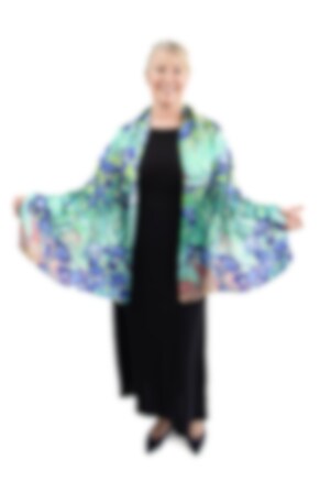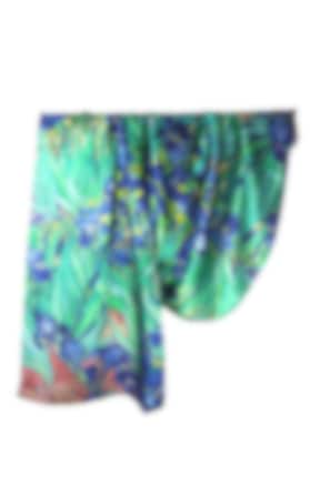 Impressionistic motif - Iris by Van Gogh. Unique art Scarf in 100% silk of the finest mullberry silk. Elegant with several nuances of shifting blue and green. Large silk Scarf of high quality which always holds the perfect warmth naturally thanks to the unique properties of the silk fibre. Amazingly soft with beautiful lustre which suits all occasions. Interesting and appealing Scarf which makes for a delightful gift!
