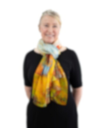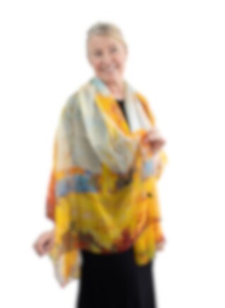 Airy silk shawl in the Golden Autumn pattern with beautiful autumn trees. Made of 100% mulberry silk in a light and transparent chiffon fabric. Size: 100x170 cm.