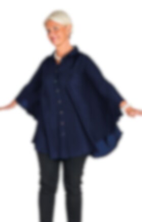 Blouse in 100% silk of crêpe de chine quality. Falls beautifully over the body, flattering any body type. Circle-cut sleeve. This model functions as either an elegant blouse or light cardigan when unbuttoned. Airy and perfect summer blouse for any event! This classic navy blue is suitable for any event.