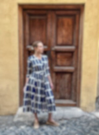 The classic wrap design features a flattering V-neckline and a tie waist that enhances your silhouette. The crisp white base with navy blue checks adds a sophisticated yet relaxed look — perfect for both everyday wear and special occasions.