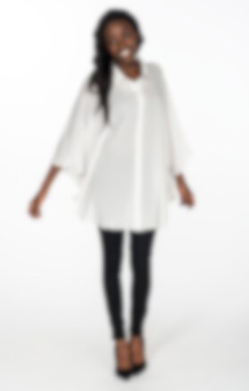 Blouse in 100% silk of crêpe de chine quality. Falls beautifully over the body, flattering any body type. Circle-cut sleeve. This model functions as either an elegant blouse or light cardigan when unbuttoned. Airy and perfect summer blouse for any event. This lovely white color is perfect for summer.