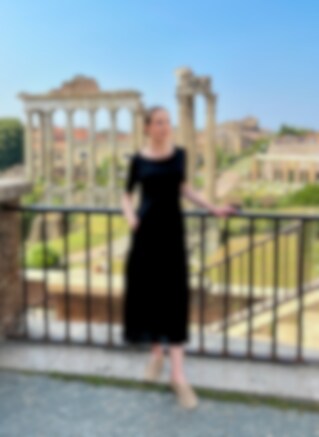 Elegant long black dress made from 100% twisted silk (145 g) with a beautiful drape. Features a round neckline, elastic detail at the front waist for a flattering fit, and two discreet side pockets. Durable yet refined, perfect for both everyday wear and special occasions.