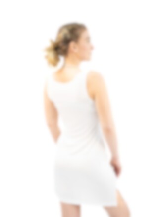 Silk nightdress in 100% mulberry silk of the softest tricot quality. Smooth, light and multifunctional design which can be worn as a dress, a nightdress or an underdress. Delightfully comfortable model in classic white, with soft and wide shoulderstraps. Ends just above the knee. Strong quality silk, non see-through.