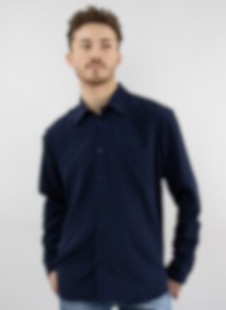 Stylish navy blue silk shirt with long sleeves and a full-spread collar with pearl buttons. Two buttons to the cuff make it easy to adjust the width of the sleeve end. Woven in crepe de chine of 100% mulberry silk.