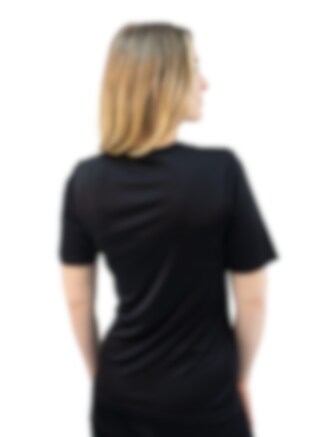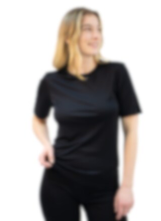 Comfortable black unisex t-shirt in 100% silk. Soft & light with a round neckline. This model is of slightly thicker silk fabric & stronger quality, making it incredibly durable for everyday use whether at the office or as sportswear.